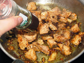 Κόβουμε σε μικρά κομματάκια το σολομό και τον ρίχνουμε κι αυτόν στο τηγάνι.